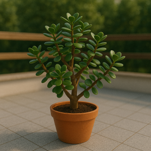 Die Jade‑Pflanze, auch Geldbaum genannt, ist eine sukkulente Zimmerpflanze mit fleischigen Blättern. Sie ist äußerst trockenresistent und bevorzugt helles, indirektes Licht. Gieße nur, wenn die Erde komplett abgetrocknet ist; abgefallene Blätter lassen sich leicht neu bewurzeln.